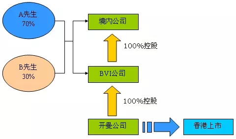 3.接著,對(duì)BVI公司增資,再與A先生和B先生進(jìn)行股權(quán)轉(zhuǎn)讓,收購(gòu)他們擁有的內(nèi)地公司的股權(quán),則內(nèi)地公司變?yōu)锽VI公司的全資子公司。BVI公司在開(kāi)曼群島或百慕大群島注冊(cè)成立一家離岸公司作為日后在香港掛牌上市的公司。